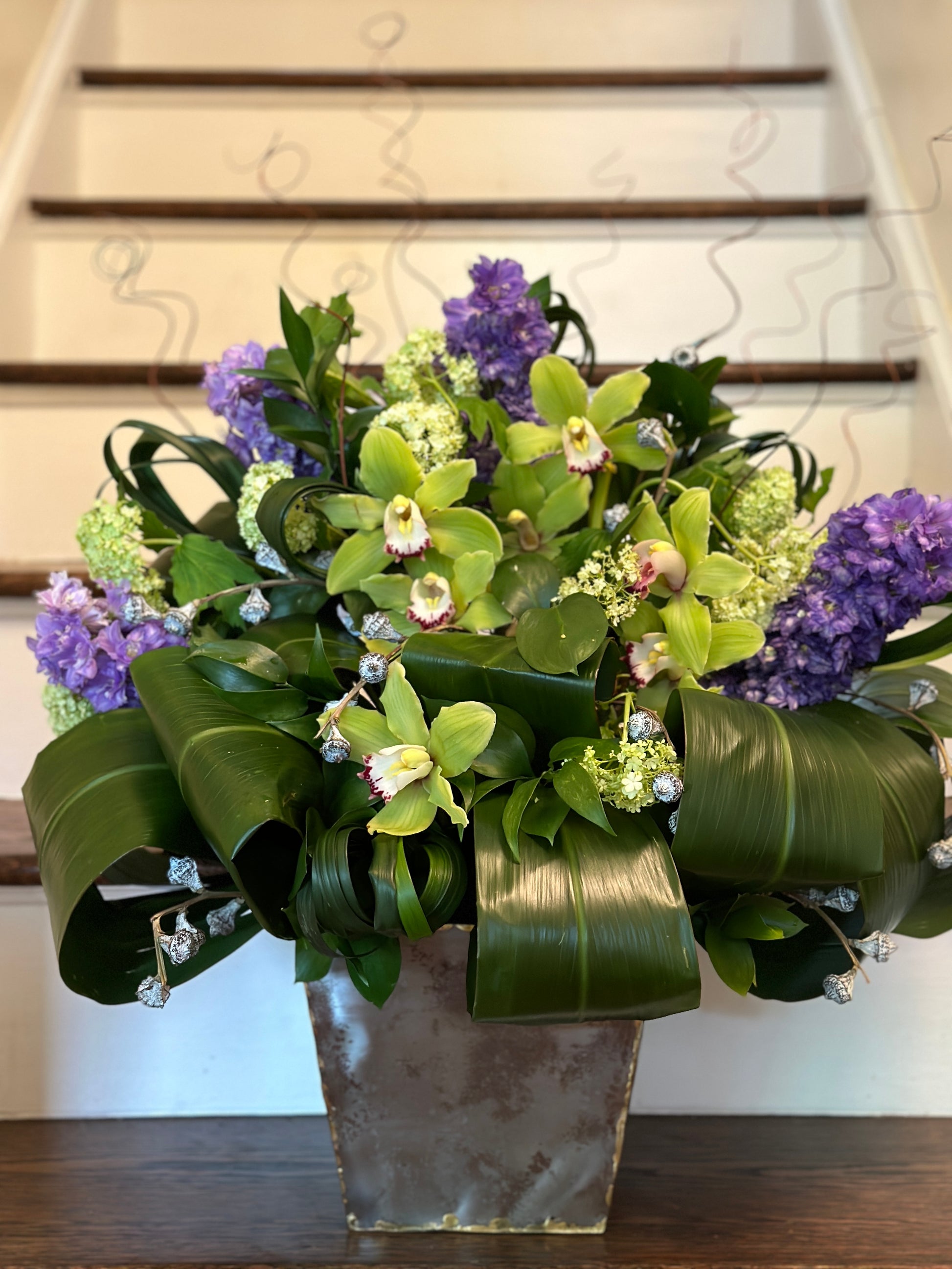 Green Cymbidium Orchids combined with Purple Delphinium in a hammered metal vase make for a ravishing statement bar floral arrangement.