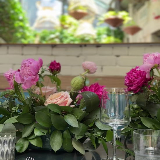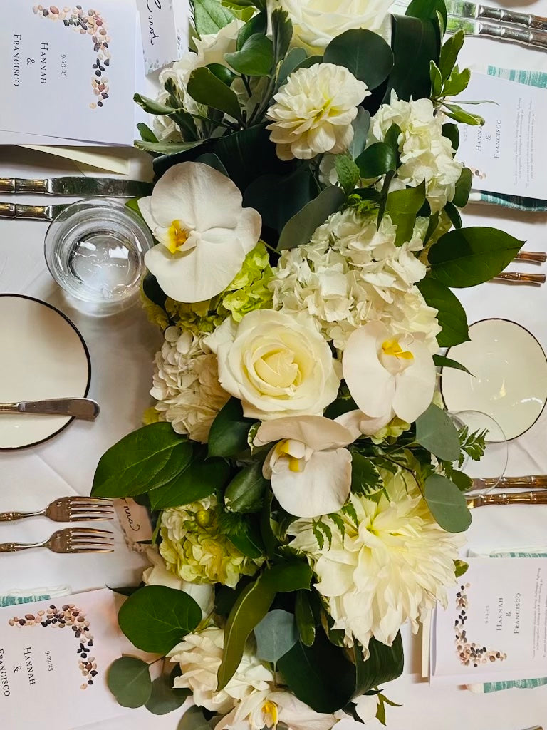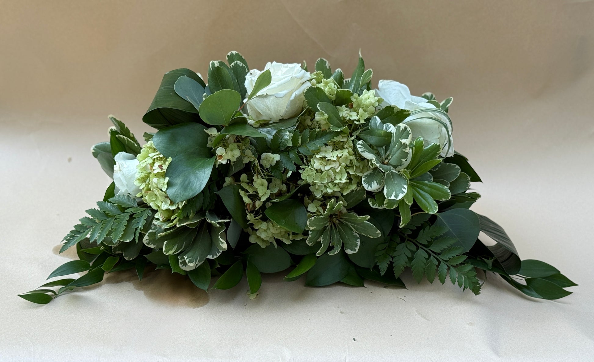 18 inch floral tray - with flowers can be elongated 1-6 inches from each side resulting in around 20-30 inches total. Basic varietal greens and white floral accents at $140, Deluxe $170 each (includes focal florals such as orchids, roses, and dahlias/peonies (season dependent).