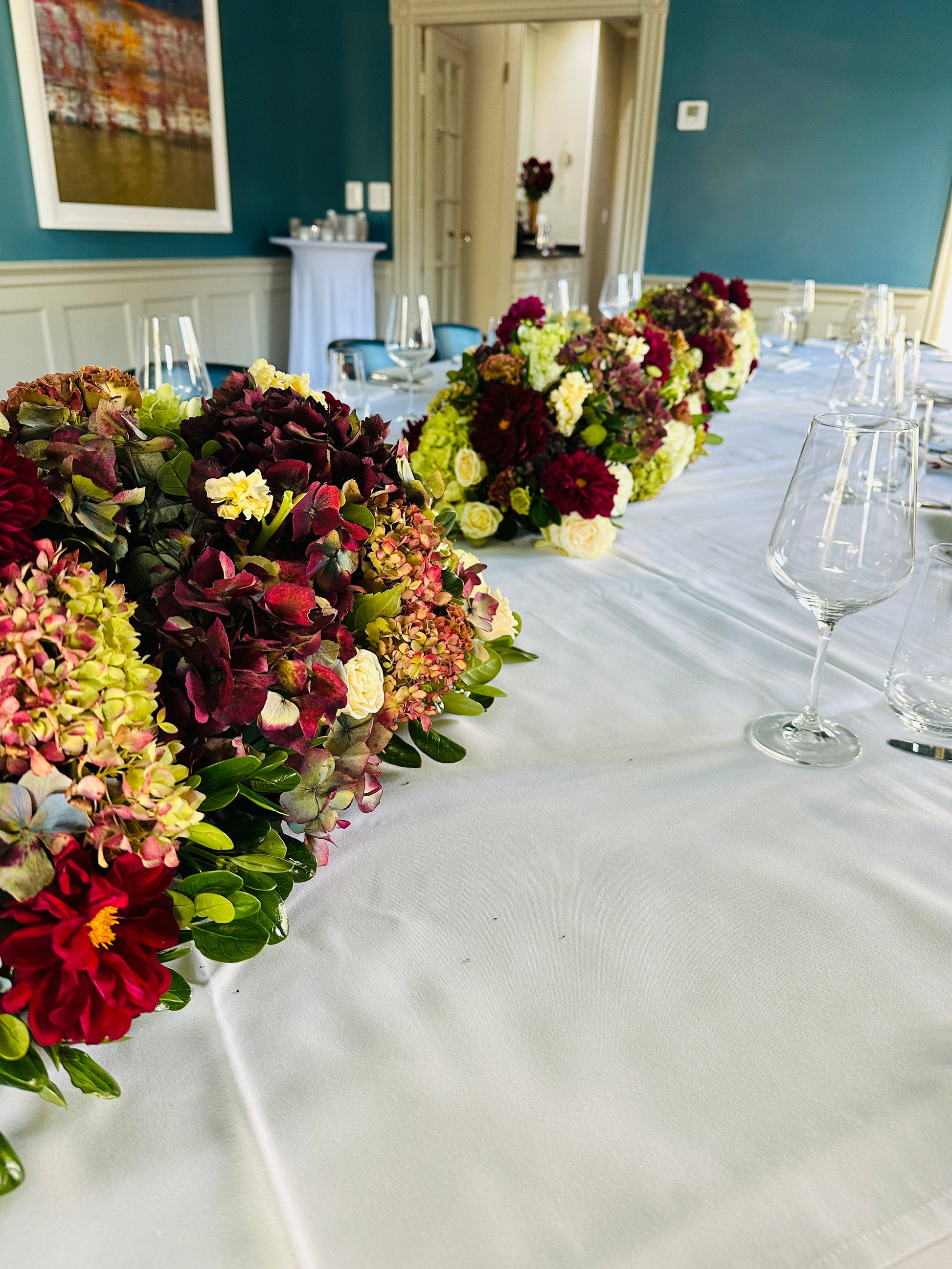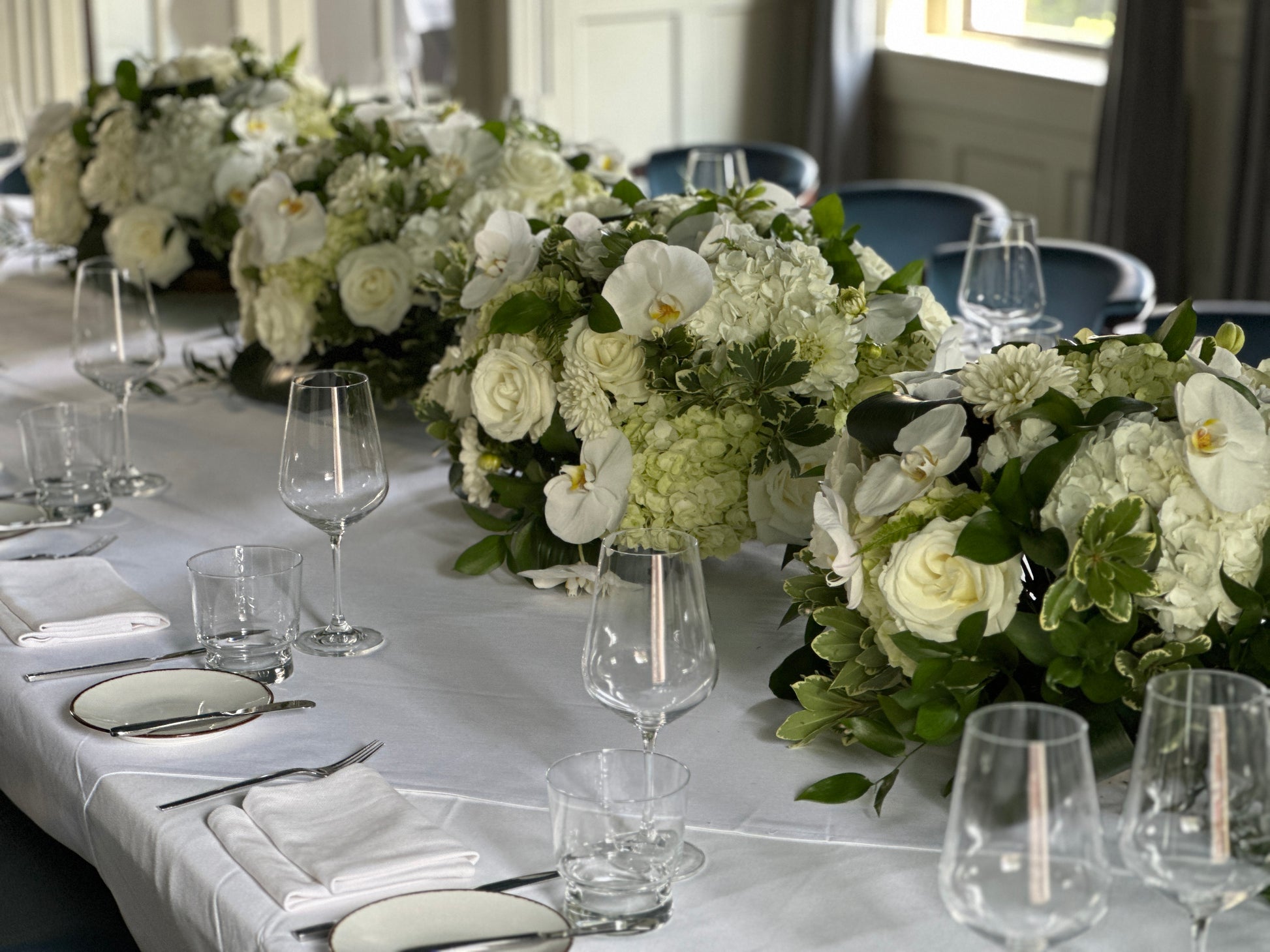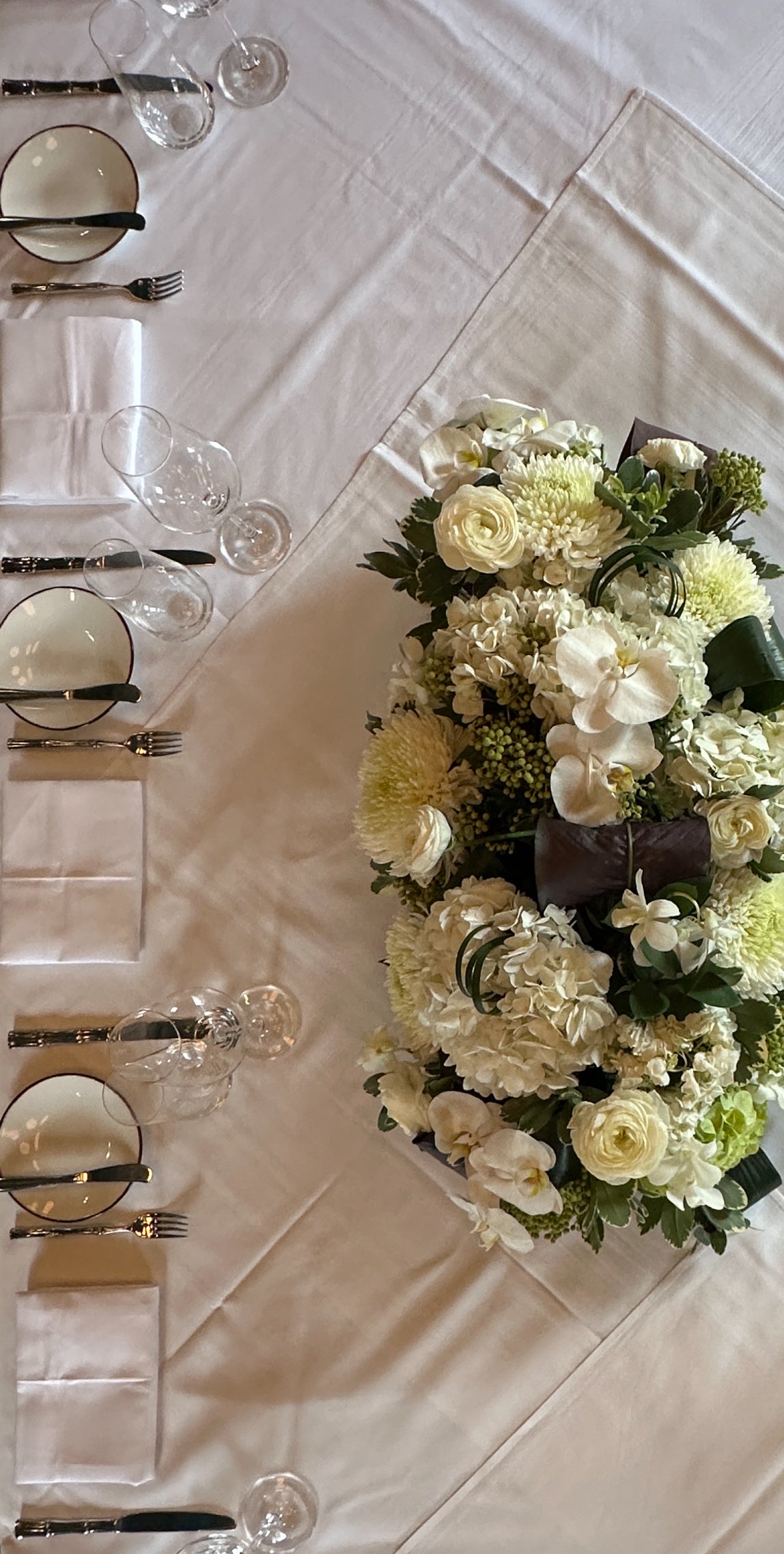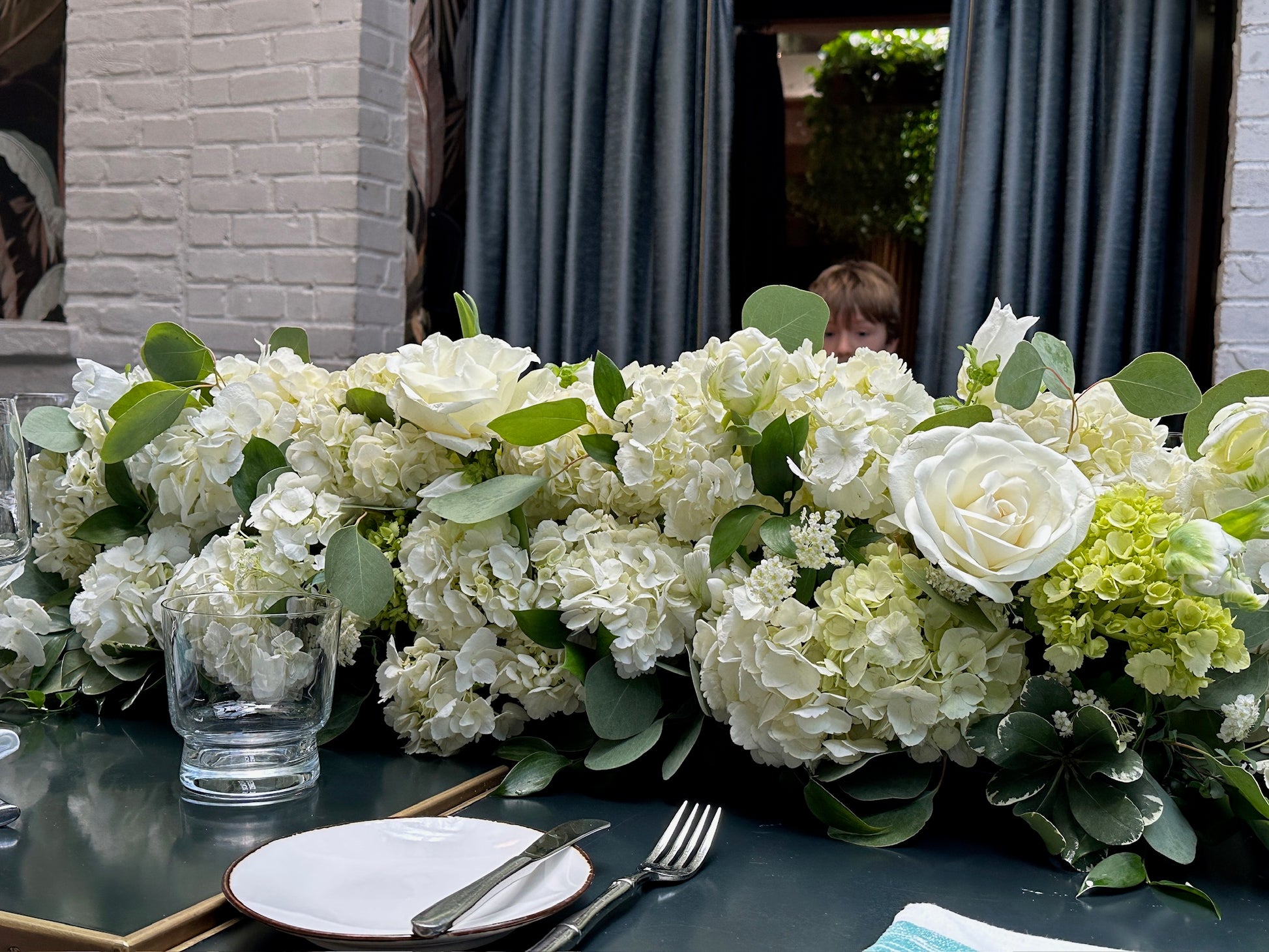 27 inch floral tray - with flowers can be elongated 1-6 inches from each side resulting in around 29-39 inches total. Basic varietal greens and white floral accents at $180, Deluxe $240 each (includes focal florals such as orchids, roses, and dahlias/peonies (season dependent).