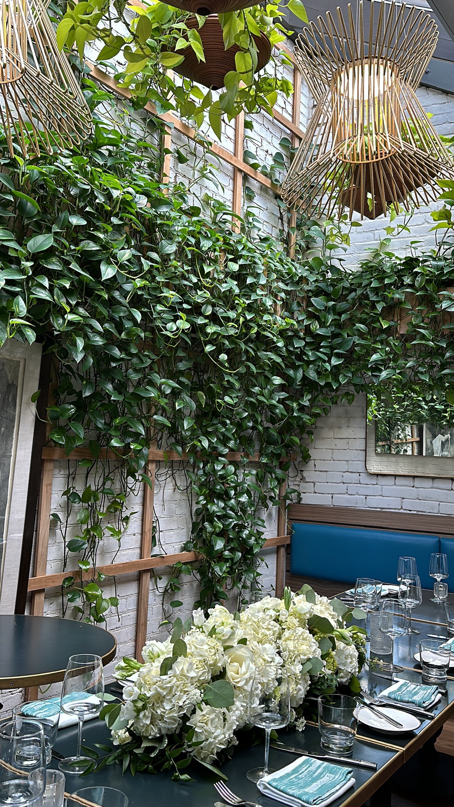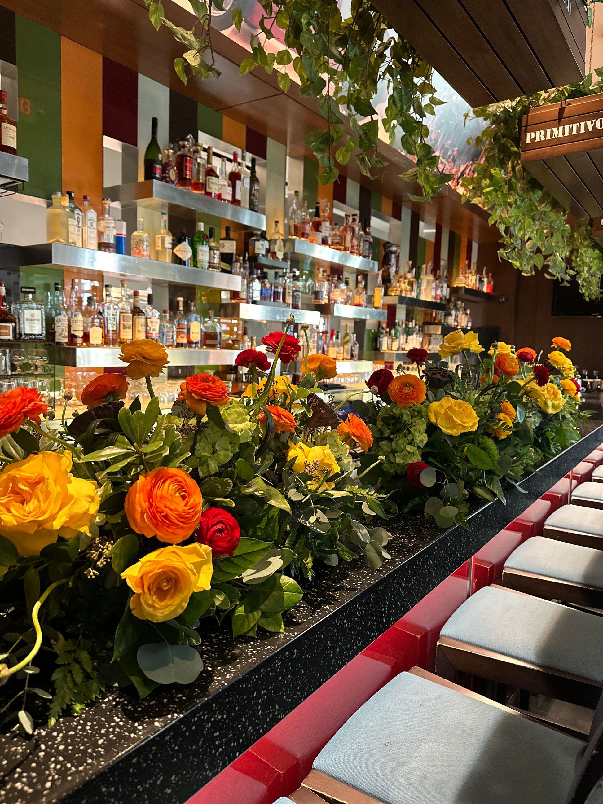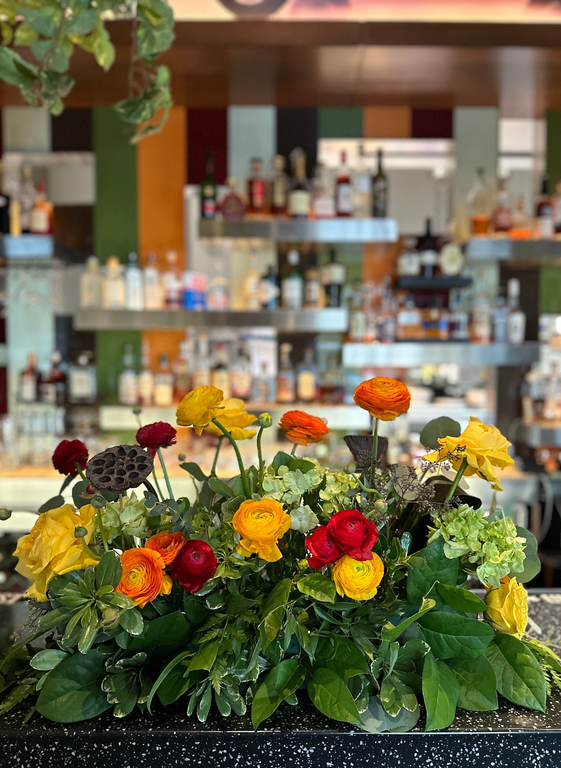 27 inch floral tray - with flowers can be elongated 1-6 inches from each side resulting in around 29-39 inches total. Basic varietal greens and white floral accents at $180, Deluxe $240 each (includes focal florals such as orchids, roses, and dahlias/peonies (season dependent).