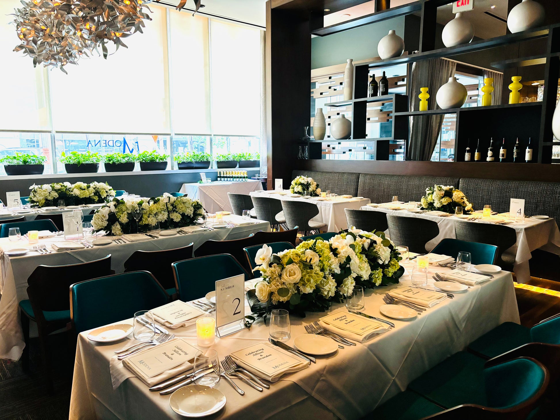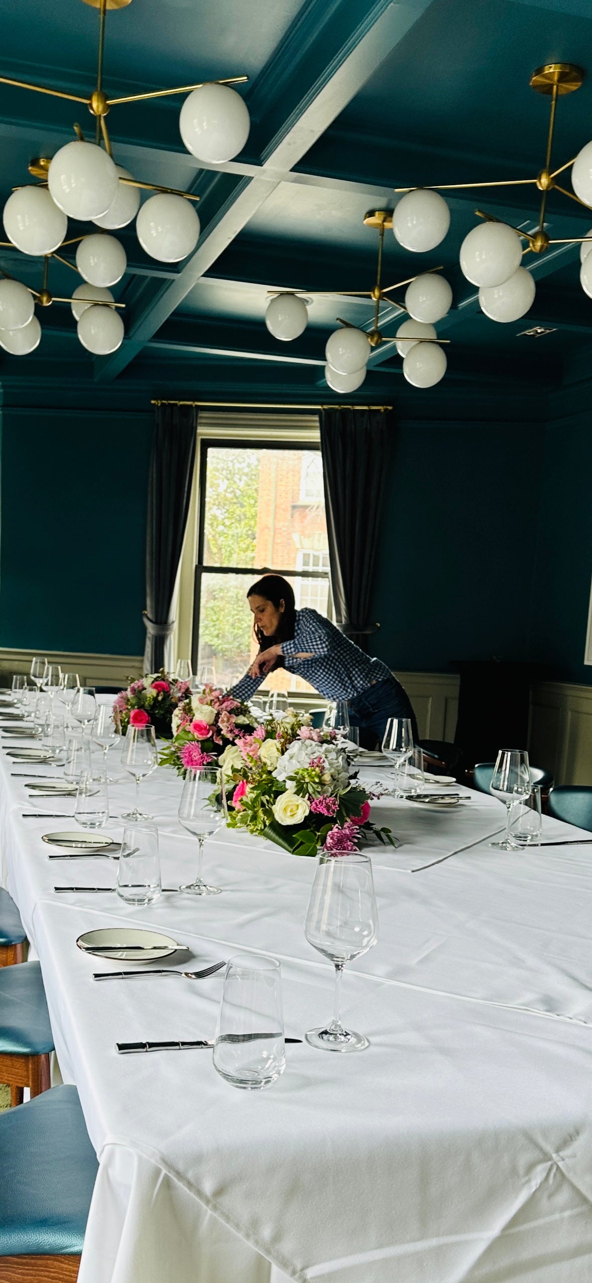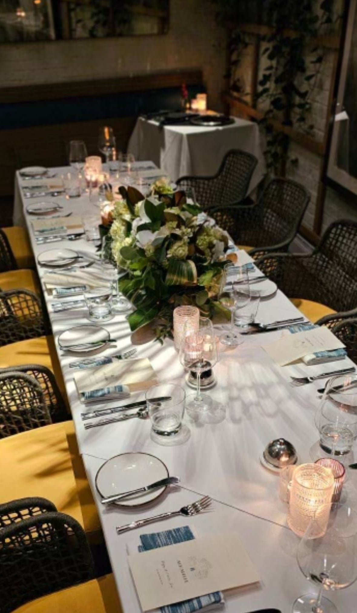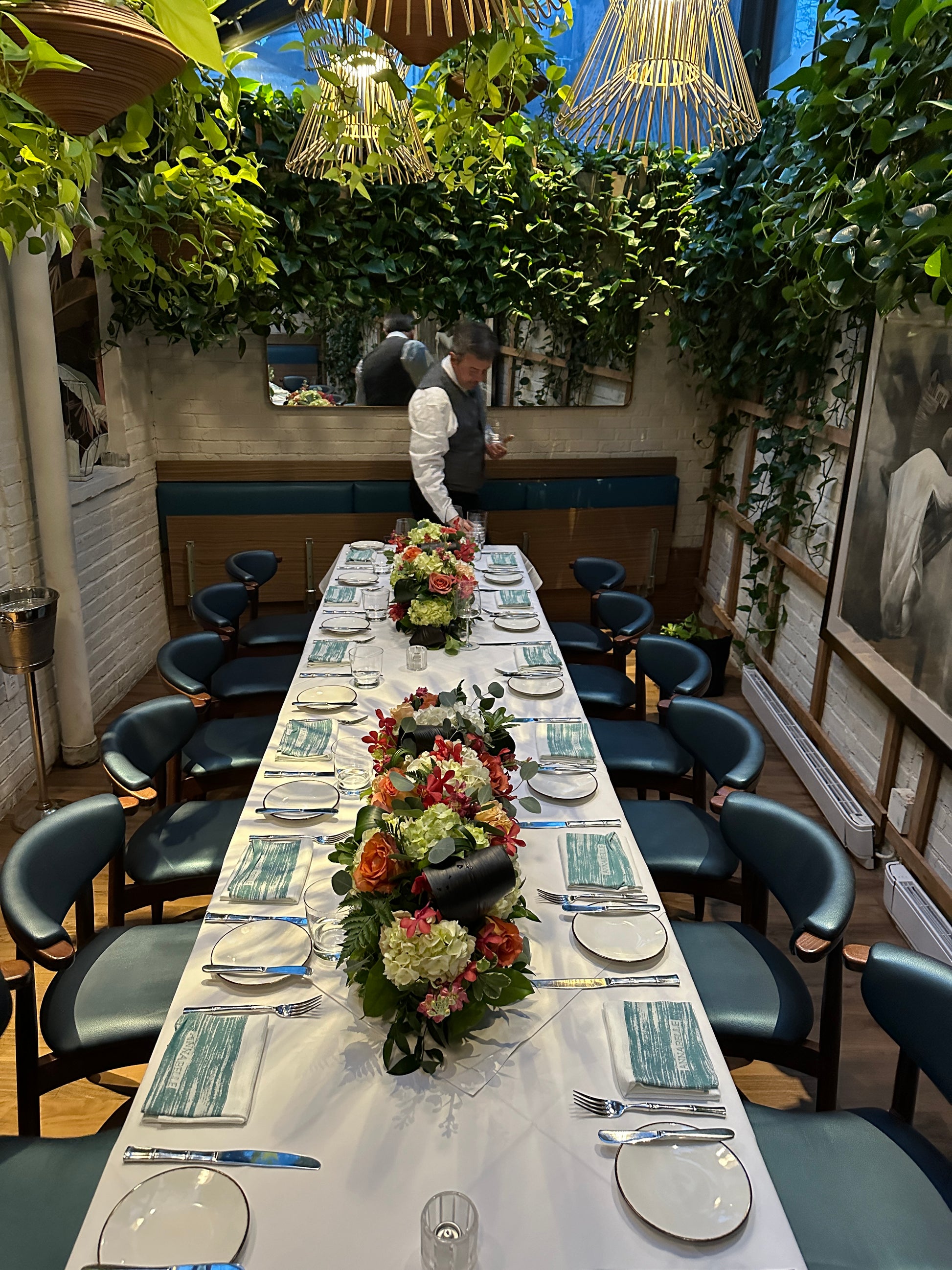 27 inch floral tray - with flowers can be elongated 1-6 inches from each side resulting in around 29-39 inches total. Basic varietal greens and white floral accents at $180, Deluxe $240 each (includes focal florals such as orchids, roses, and dahlias/peonies (season dependent).