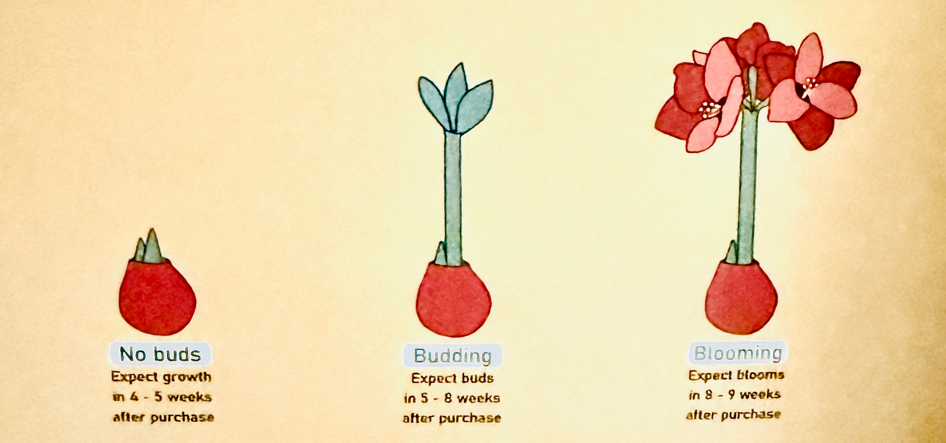 Waxed Amaryllis Bulb with Holiday Red Blossoms blooming throughout the holiday season. Each bulb has been soaked in water and then dipped in wax to seal in the moisture. Vibrant Gold and Silver Amaryllis bulbs sit upright on their own and require no watering or maintenance. The beginning of each budding to first blossom generally takes anywhere from 7-8 weeks. After that, each blossom lasts for up to a week. Remember each bud has 3-5 blossoms, and each bulb has 3 buds. Waxed Amaryllis make for perfect holiday gifts for teachers, friends, hosts, neighbors, and for yourself.