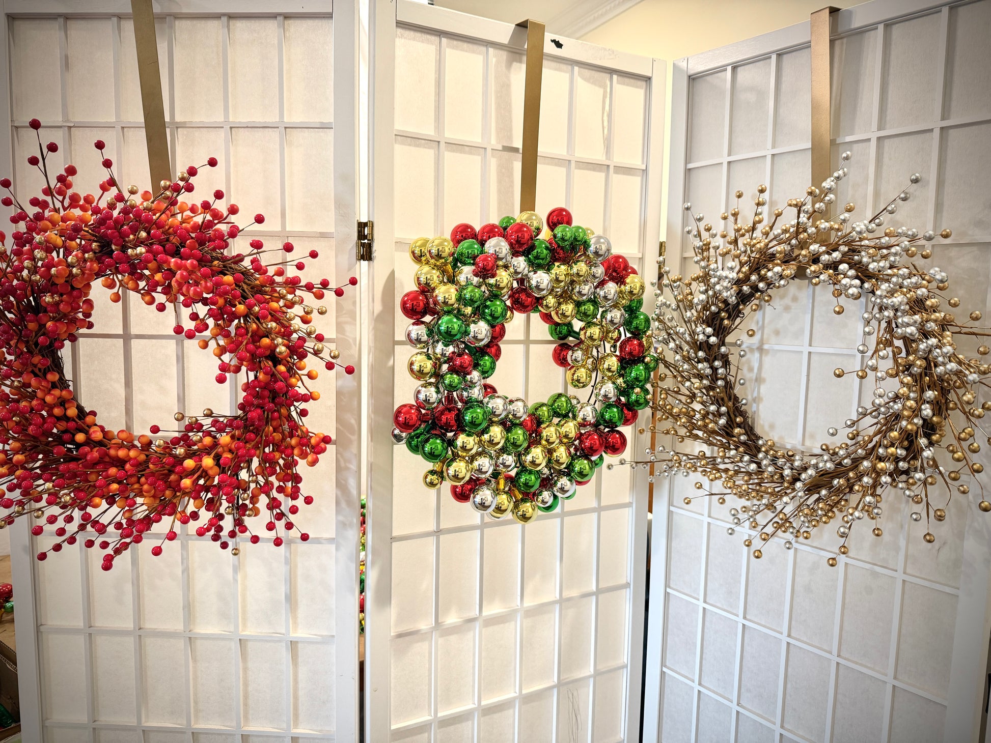 Festive wreaths on a 12 inch grapevine base for the holidays. Hang them on your front door or on a mirror in your home to brighten up the season.